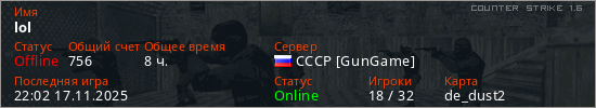Играет на Counter Strike 1.6 сервере. Страна: РоссияПервый раз замечен 17:05 15.06.2023