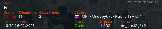 Последний раз был в сети 16:32 26.02.2025 Игрок с таким ником замечен на 66 серверах