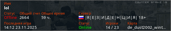 Играет на Counter Strike 1.6 сервере. Страна: РоссияПервый раз замечен 12:18 22.01.2019