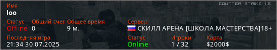 Играет на Counter Strike 1.6 сервере. Страна: РоссияПервый раз замечен 18:06 27.07.2025