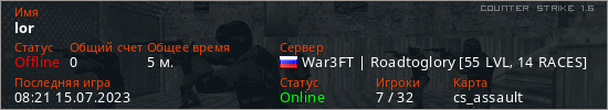Играет на Counter Strike 1.6 сервере. Страна: РоссияПервый раз замечен 08:16 15.07.2023