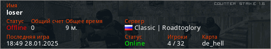 Играет на Counter Strike 1.6 сервере. Страна: РоссияПервый раз замечен 17:09 16.12.2024