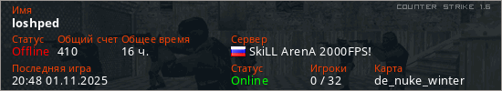 Играет на Counter Strike 1.6 сервере. Страна: РоссияПервый раз замечен 18:05 16.02.2025