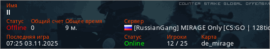Играет на Counter Strike Global Offensive сервере. Страна: РоссияПервый раз замечен 18:50 10.10.2025
