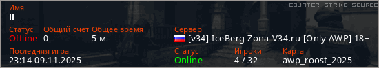 Играет на Counter Strike Source сервере. Страна: РоссияПервый раз замечен 23:01 09.11.2025