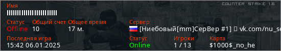 Играет на Counter Strike 1.6 сервере. Страна: РоссияПервый раз замечен 13:00 03.01.2025