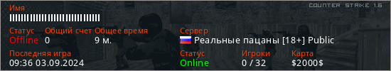 Играет на Counter Strike 1.6 сервере. Страна: РоссияПервый раз замечен 23:11 11.12.2023
