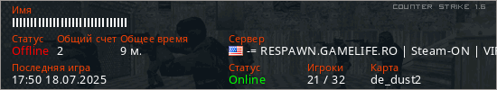 Играет на Counter Strike 1.6 сервере. Страна: СШАПервый раз замечен 14:56 20.04.2025