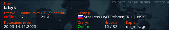 Играет на Counter Strike Global Offensive сервере. Страна: РоссияПервый раз замечен 21:13 04.10.2025