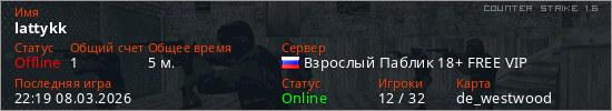 Играет на Counter Strike 1.6 сервере. Страна: РоссияПервый раз замечен 22:11 08.03.2026