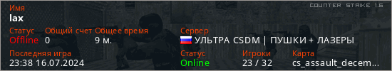 Играет на Counter Strike 1.6 сервере. Страна: РоссияПервый раз замечен 16:38 02.06.2024