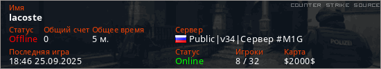 Играет на Counter Strike Source сервере. Страна: РоссияПервый раз замечен 18:44 25.09.2025
