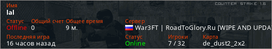 Последний раз был в сети 13 часов назад Игрок с таким ником замечен на 8 серверах