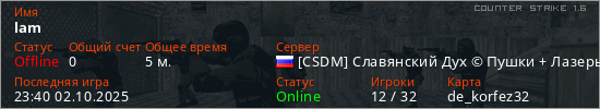 Играет на Counter Strike 1.6 сервере. Страна: РоссияПервый раз замечен 22:59 02.10.2025