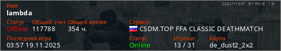 Последний раз был в сети 03:57 19.11.2025 Игрок с таким ником замечен на 31 сервере