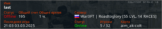 Играет на Counter Strike 1.6 сервере. Страна: РоссияПервый раз замечен 21:55 02.10.2021