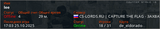 Последний раз был в сети 17:03 25.10.2025 Игрок с таким ником замечен на 29 серверах