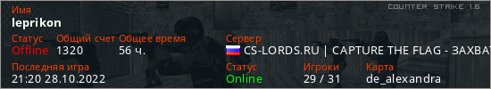 Последний раз был в сети 21:20 28.10.2022 Игрок с таким ником замечен на 5 серверах