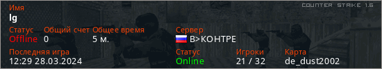 Играет на Counter Strike 1.6 сервере. Страна: РоссияПервый раз замечен 12:06 28.03.2024