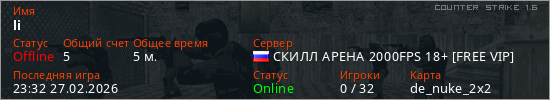 Играет на Counter Strike 1.6 сервере. Страна: РоссияПервый раз замечен 23:30 27.02.2026