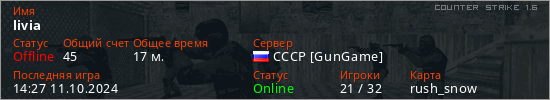 Играет на Counter Strike 1.6 сервере. Страна: РоссияПервый раз замечен 20:06 10.10.2024