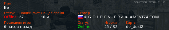 Играет на Counter Strike 1.6 сервере. Страна: РоссияПервый раз замечен 22:34 29.11.2025