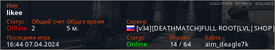Играет на Counter Strike Source сервере. Страна: РоссияПервый раз замечен 16:05 07.04.2024