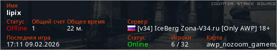 Играет на Counter Strike Source сервере. Страна: РоссияПервый раз замечен 23:18 07.02.2026