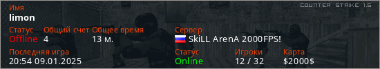 Играет на Counter Strike 1.6 сервере. Страна: РоссияПервый раз замечен 01:17 03.04.2023