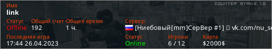 Последний раз был в сети 17:44 26.04.2023 Игрок с таким ником замечен на 16 серверах