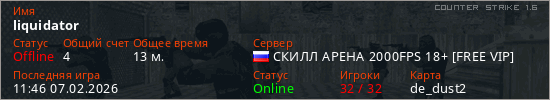 Играет на Counter Strike 1.6 сервере. Страна: РоссияПервый раз замечен 09:07 07.02.2026