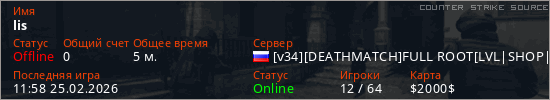 Играет на Counter Strike Source сервере. Страна: РоссияПервый раз замечен 11:36 25.02.2026