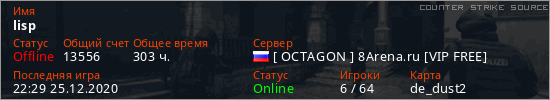 Играет на Counter Strike Source сервере. Страна: РоссияПервый раз замечен 12:50 27.03.2020