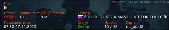 Играет на Counter Strike Global Offensive сервере. Страна: РоссияПервый раз замечен 07:25 21.11.2025