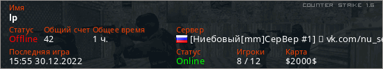 Последний раз был в сети 15:55 30.12.2022 Игрок с таким ником замечен на 9 серверах