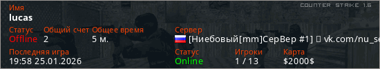 Играет на Counter Strike 1.6 сервере. Страна: РоссияПервый раз замечен 19:55 25.01.2026