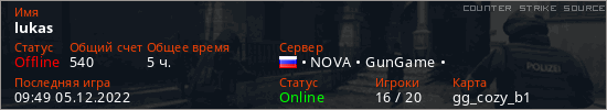 Играет на Counter Strike Source сервере. Страна: РоссияПервый раз замечен 17:39 28.11.2022