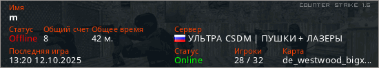 Последний раз был в сети 13:20 12.10.2025 Игрок с таким ником замечен на 52 серверах