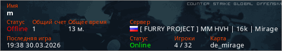 Играет на Counter Strike Global Offensive сервере. Страна: РоссияПервый раз замечен 18:59 30.03.2026
