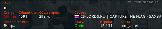 Играет на Counter Strike 1.6 сервере. Страна: РоссияПервый раз замечен 20:52 13.09.2021