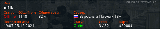 Играет на Counter Strike 1.6 сервере. Страна: РоссияПервый раз замечен 12:15 20.10.2019