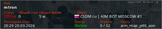 Играет на Counter Strike 1.6 сервере. Страна: РоссияПервый раз замечен 19:04 20.03.2026