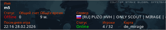 Играет на Counter Strike Global Offensive сервере. Страна: РоссияПервый раз замечен 05:33 21.02.2026
