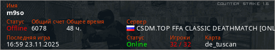 Последний раз был в сети 16:59 23.11.2025 Игрок с таким ником замечен на 19 серверах
