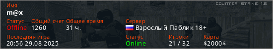 Последний раз был в сети 20:56 29.08.2025 Игрок с таким ником замечен на 8 серверах