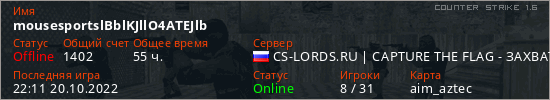 Играет на Counter Strike 1.6 сервере. Страна: РоссияПервый раз замечен 09:04 26.08.2020