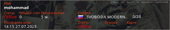 Играет на Call of Duty 4: Modern Warfare сервере. Страна: РоссияПервый раз замечен 14:13 27.07.2025