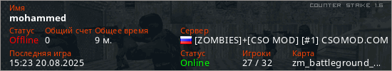 Играет на Counter Strike 1.6 сервере. Страна: РоссияПервый раз замечен 10:41 20.08.2025