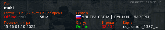 Играет на Counter Strike 1.6 сервере. Страна: РоссияПервый раз замечен 21:26 27.09.2025