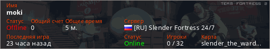 Играет на Team Fortress 2 сервере. Страна: РоссияПервый раз замечен 22:03 22.04.2026